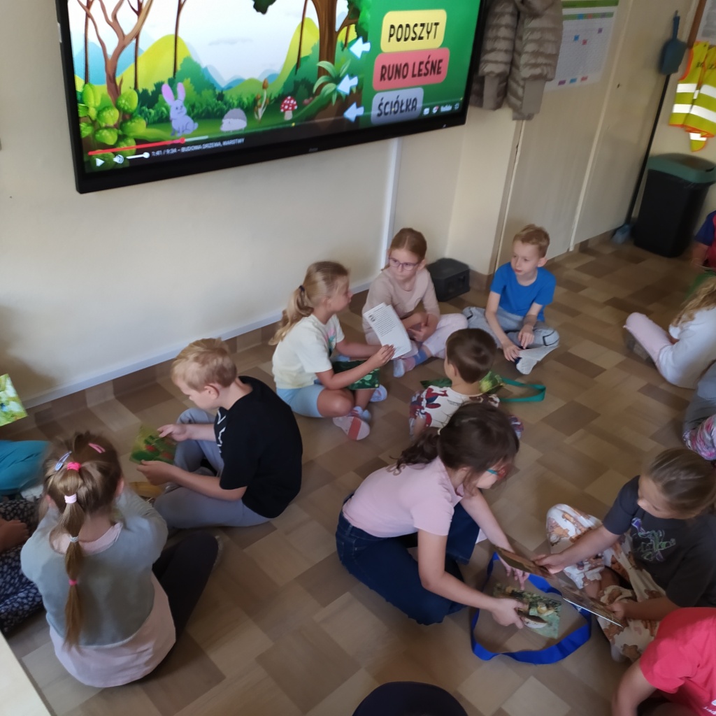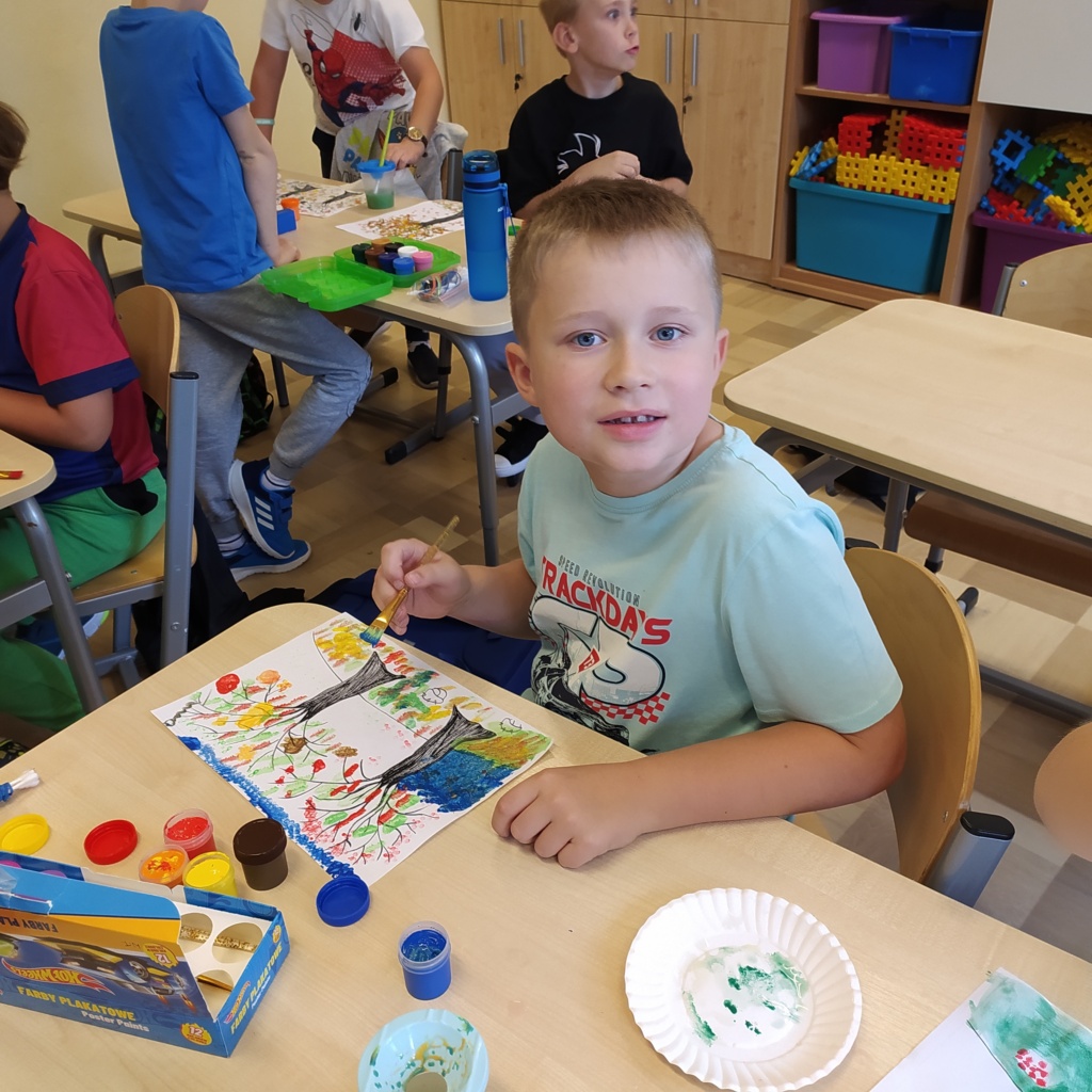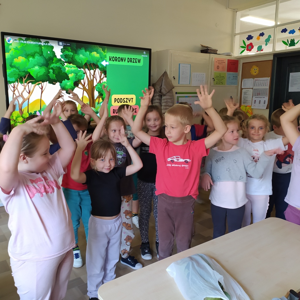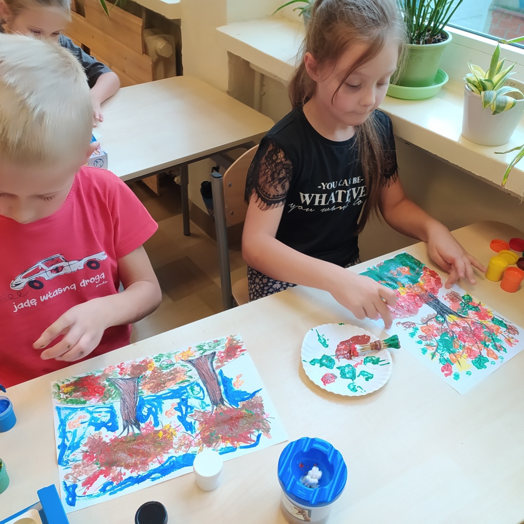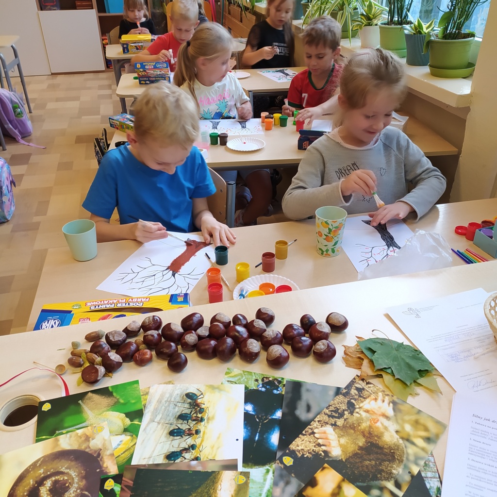Z radością powitaliśmy w naszej klasie „Panią Jesień”. Dzieci przyniosły znalezione przez siebie skarby lasu: kolorowe liście, kasztany, żołędzie, szyszki, bukowe orzechy, owoce jarzębiny i korę drzew. Na zajęciach obejrzały prezentację multimedialną pt.:” Las i jego mieszkańcy”. W czasie zajęć pracowały w małych grupach zadaniowych. Nauczyły się rozpoznawać warstwy lasu, występujące w nim zwierzęta, rozpoznawały gatunki drzew liściastych i iglastych. Dowiedziały się jak drzewa przygotowują się do nadejścia zimy. Dzieci wykonały piękne pejzaże jesienne malowane za pomocą patyczków higienicznych i farb plakatowych.
