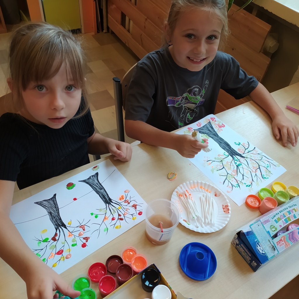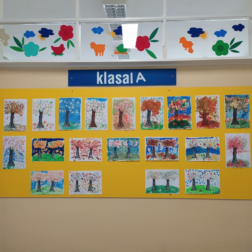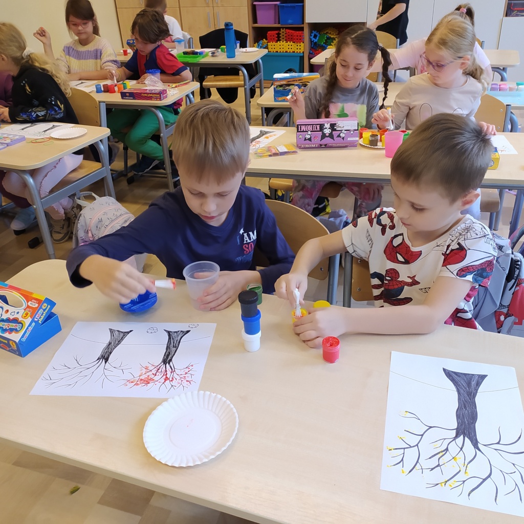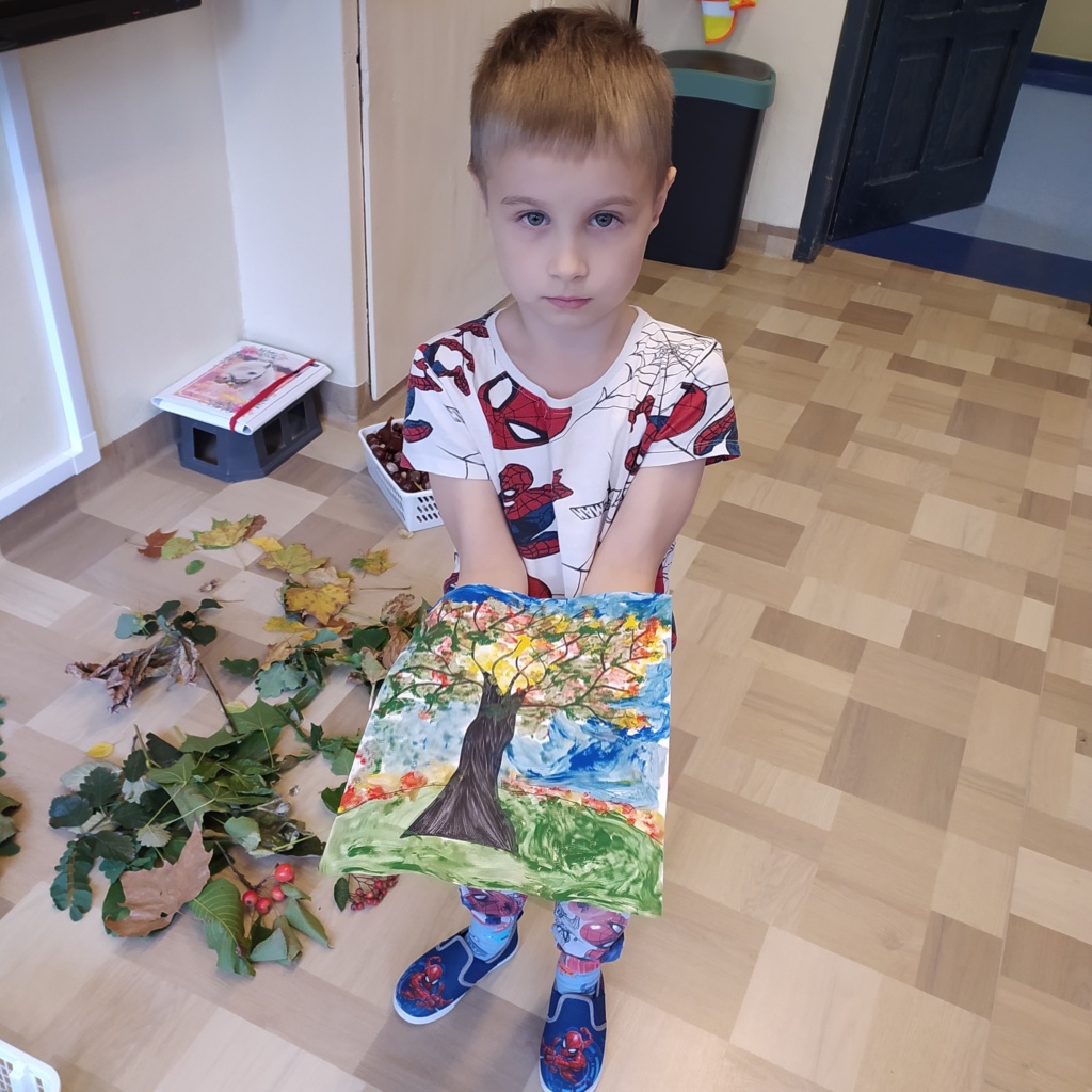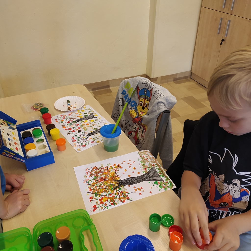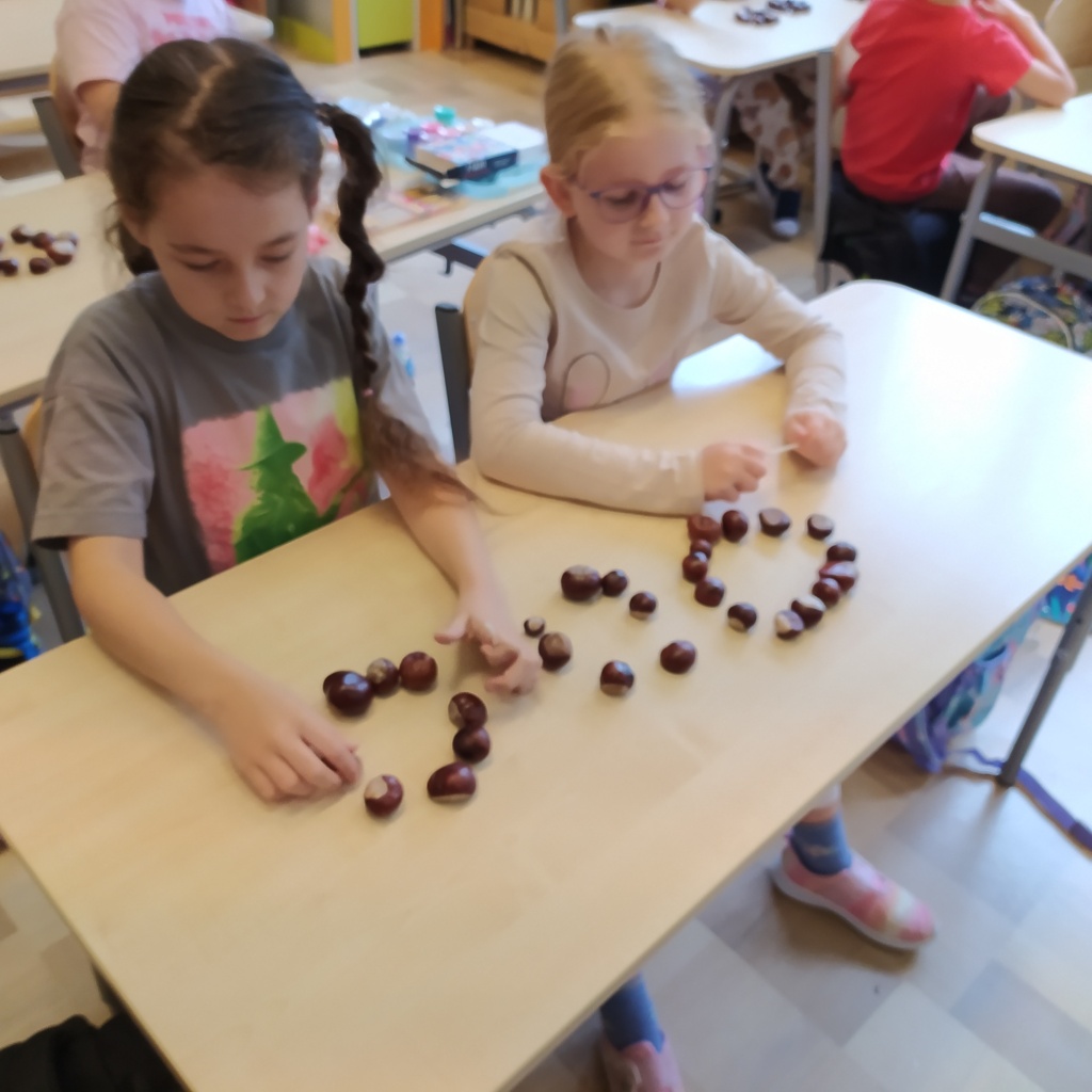 Z radością powitaliśmy w naszej klasie „Panią Jesień”. Dzieci przyniosły znalezione przez siebie skarby lasu: kolorowe liście, kasztany, żołędzie, szyszki, bukowe orzechy, owoce jarzębiny i korę drzew. Na zajęciach obejrzały prezentację multimedialną pt.:” Las i jego mieszkańcy”. W czasie zajęć pracowały w małych grupach zadaniowych. Nauczyły się rozpoznawać warstwy lasu, występujące w nim zwierzęta, rozpoznawały gatunki drzew liściastych i iglastych. Dowiedziały się jak drzewa przygotowują się do nadejścia zimy. Dzieci wykonały piękne pejzaże jesienne malowane za pomocą patyczków higienicznych i farb plakatowych.