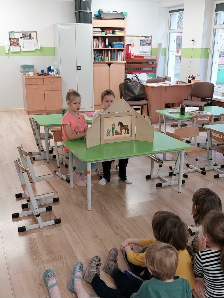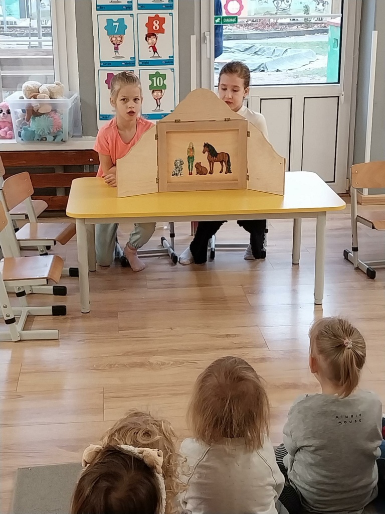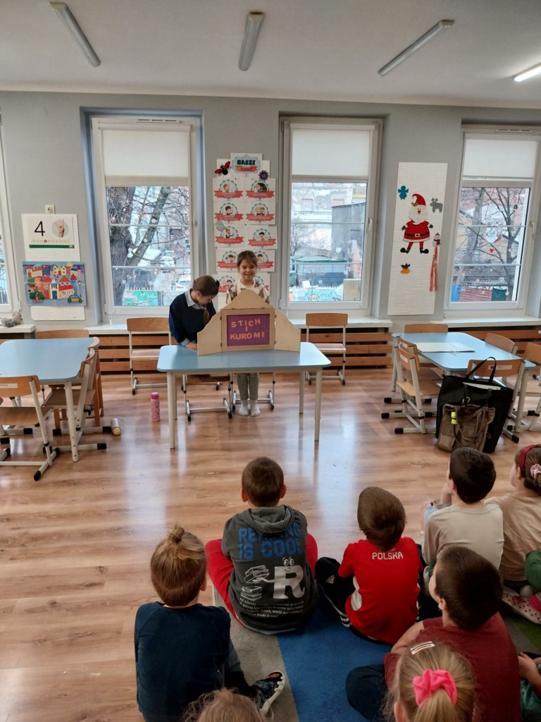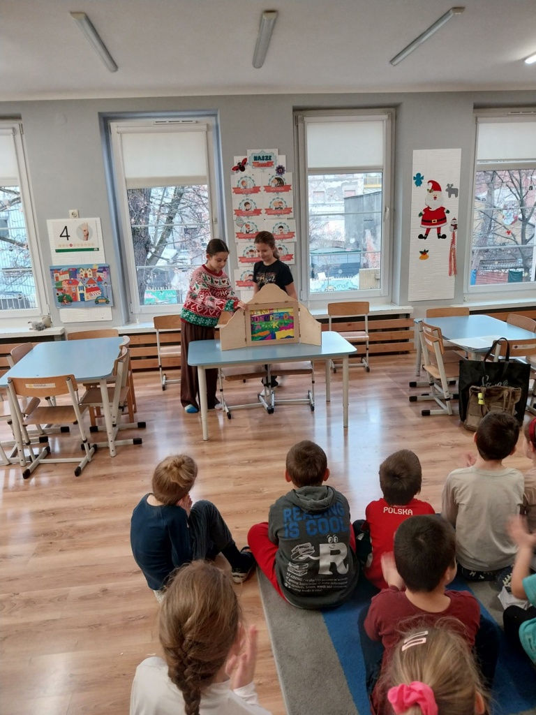 Uczennice z klasy: 2a, 2b, 4b i 4c: Misia Trybuła, Nastka Kolano, Aurelka Krawczuk, Ala Tkacz, Jagoda Sereda, Olga Retecka, Natalka Godlewska, Maja Szmigiel, Aniela Pudło i Zuzia Andruszkiewicz zaprezentowały w Przedszkolu nr 33 autorskie bajki formie teatrzyku Kamishibai: „Stich i Kuromi”, „Wizyta w schronisku”, Magiczne safari”, „Sekret ponurego zamku” i „Przygoda Pioruna”. Spektakle obejrzały cztery grupy przedszkolaków, które z uwagą śledziły losy bohaterów. Dziewczynki zostały obdarowane przez Dyrekcję Przedszkola słodkościami. Teatrzyki bardzo podobały się przedszkolakom i z niecierpliwością czekają na kolejne spektakle.