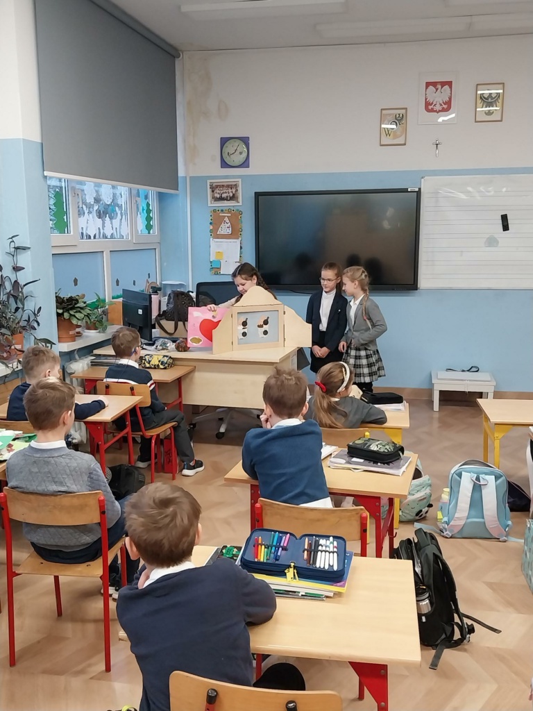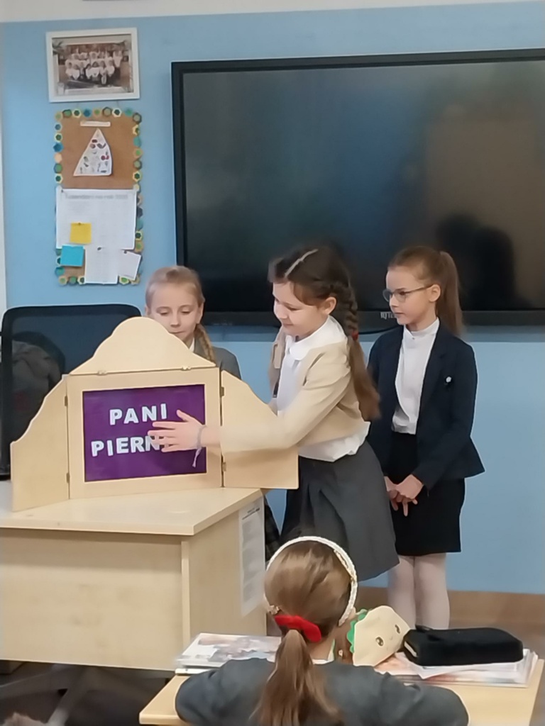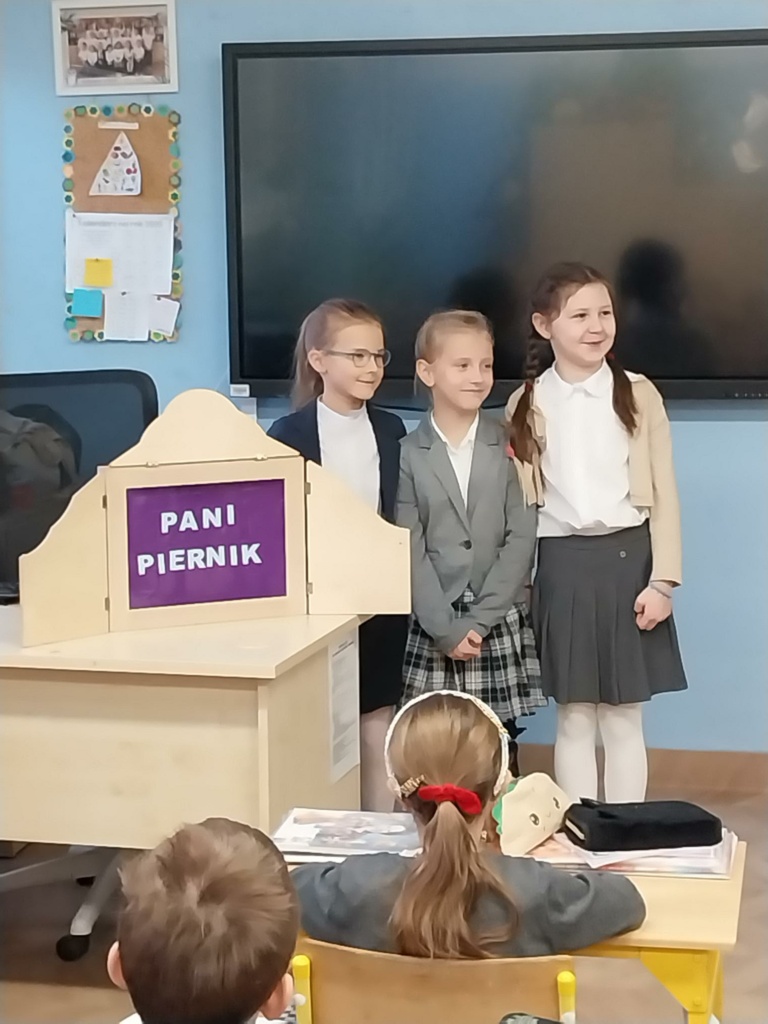 Aurelia Krawczuk, Felicja Stankiewicz i Mira Bednarz z kl. 3a przygotowały i zaprezentowały koleżankom i kolegom z klasy swój autorski teatrzyk Kamishibai „Pani Piernik”. Uczniowie z uwagą wysłuchali historii pani Piernik, która zmieniła się na lepsze, gdy poznała pana Dobrego. Dziewczynki wykonały autorskie ilustracje techniką kolażu. Zapraszamy do obejrzenia fotorelacji z prezentacji teatrzyku i wybranych kart, które wykonały twórczynie z klasy 3a.
