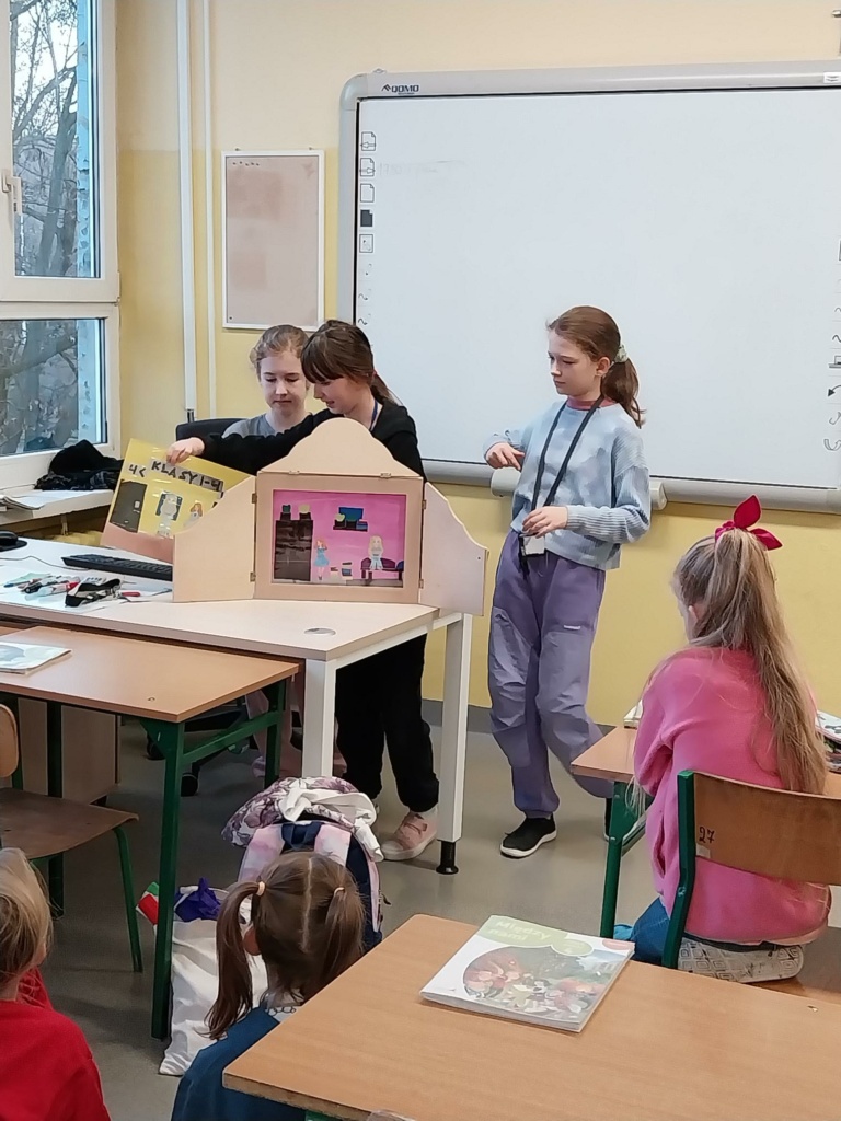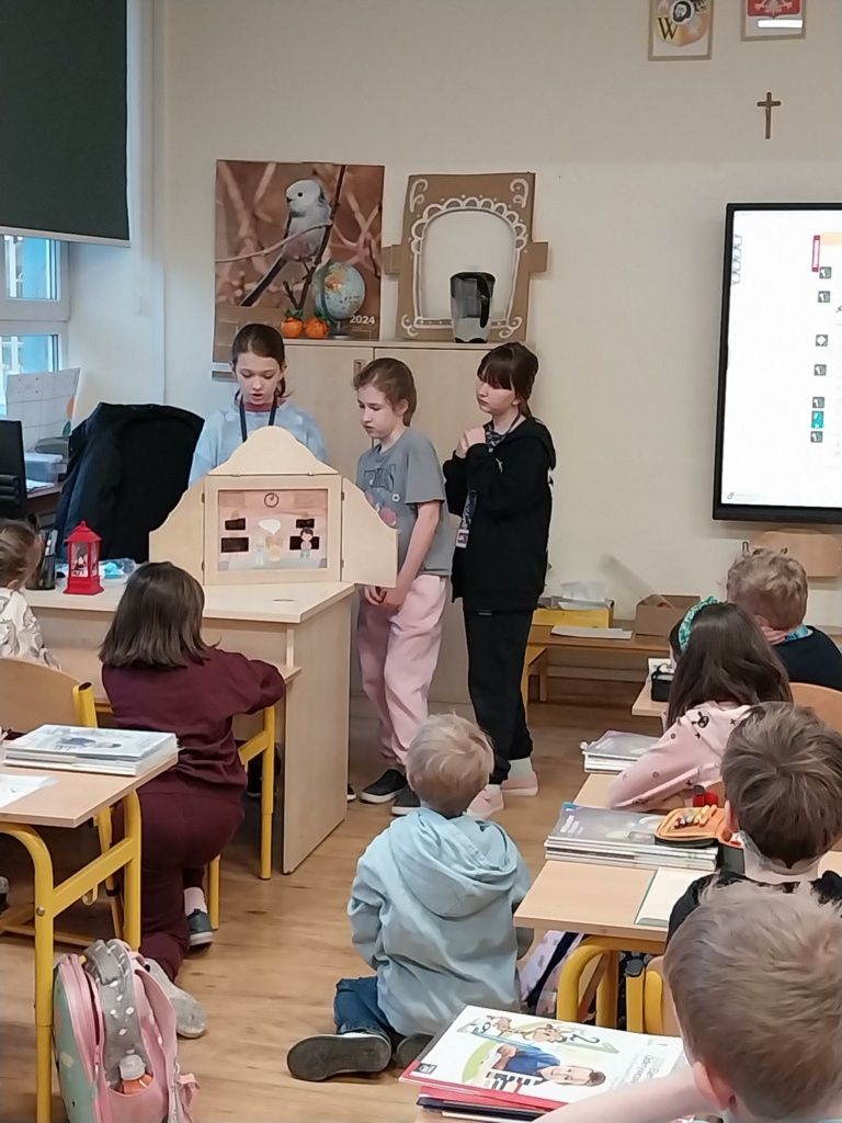 Łucja Noculak, Tosia Kajda i Zuzia Andruszkiewicz z kl. 4c przygotowały i zaprezentowały koleżankom i kolegom z klasy swój autorski teatrzyk Kamishibai „Przeprowadzka”. Uczniowie klasy 1b i 4c z uwagą wysłuchali historii Oli, która musiała rozstać się ze swoją przyjaciółką z powodu jej wyjazdu za granicę. Dziewczynki wykonały autorskie ilustracje techniką kolażu. Zapraszamy do obejrzenia fotorelacji z prezentacji teatrzyku i wybranych kart, które wykonały twórczynie z klasy 4c.