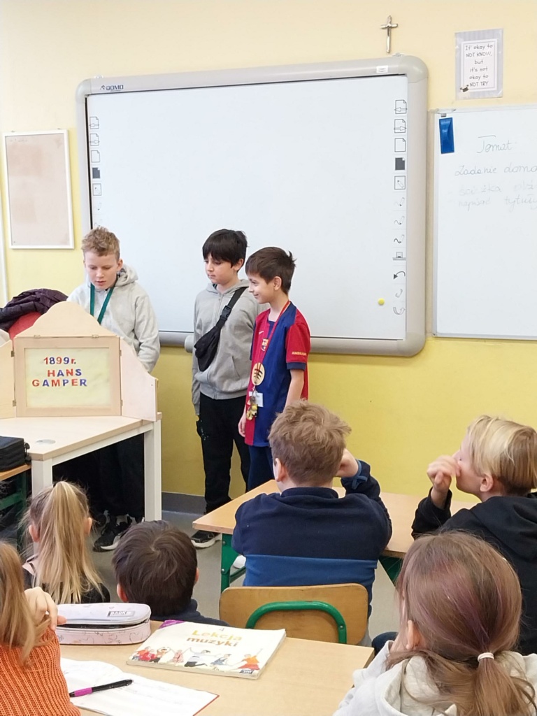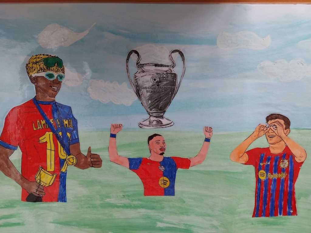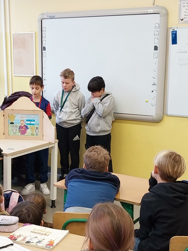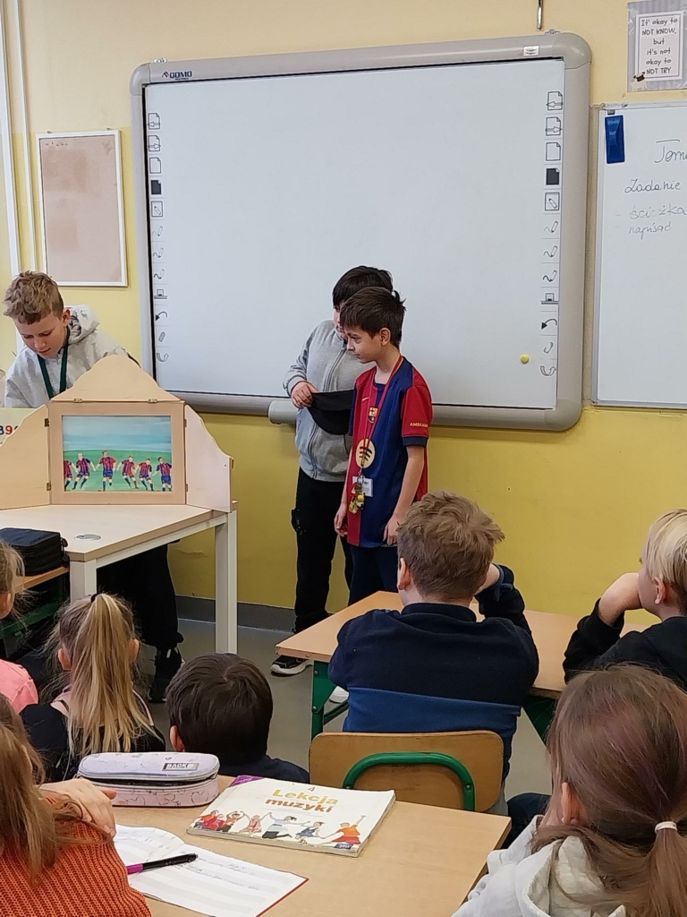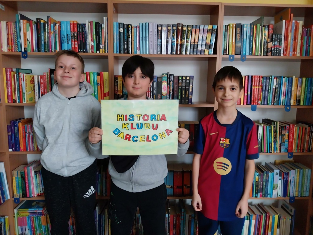 Uczniowie z kl. 4c: Marco Giordano, Maksymilian Spychała i Bartosz Milewicz przygotowali i zaprezentowali koleżankom i kolegom z klasy swój autorski teatrzyk Kamishibai „Historia klubu Barcelona”. Uczniowie klasy 4c z uwagą wysłuchali historii klubu FC Barcelona jak i o zawodnikach i marzeniach trójki chłopców, którzy również chcą w przyszłości zostać piłarzami wspomnianego klubu. Marco, Maks i Bartek wykonali autorskie ilustracje techniką kolażu. Zapraszamy do obejrzenia fotorelacji z prezentacji teatrzyku i wybranych kart wykonanych przez młodych piłkarzy.