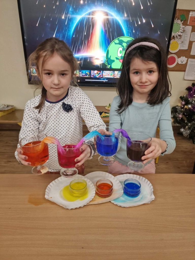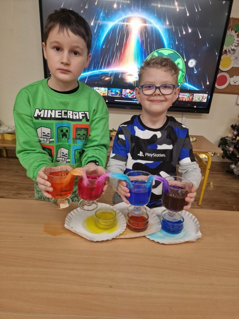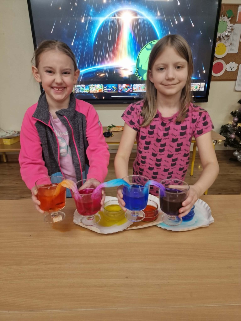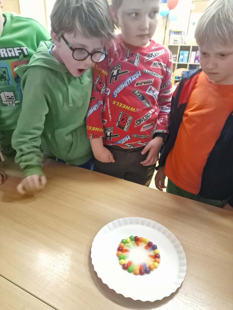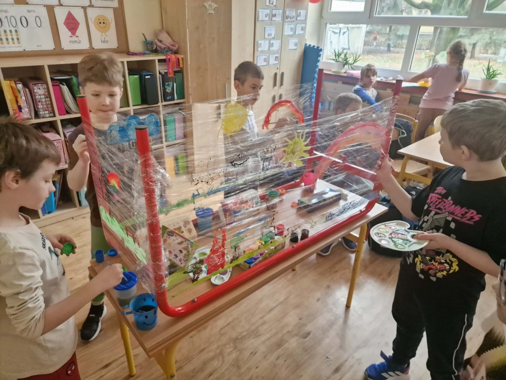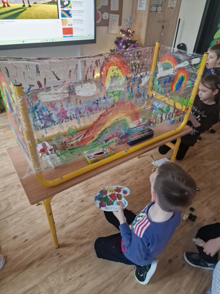 Dzieci miały wspaniały dzień pełnym kolorów! Malowały na folii, która owijała stoliki, tworząc tęczowe wzory. Korzystały z taśmy przezroczystej i flamastrów, aby wyświetlać kolory za pomocą latarek. Tworzyły kolorowe kotki i króliki z kolorowych pasów, a także tęcze z rozpuszczanych cukierków. Wykonywały wędrującą i wybuchową tęczę, która zachwyciła wszystkich. Miały również kolorowy poczęstunek z warzyw i owoców, które przyniosły z domu. To był czas wesoły i kolorowy, a przy tym pełen nowej wiedzy i doświadczeń.