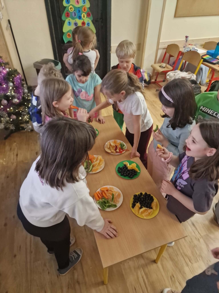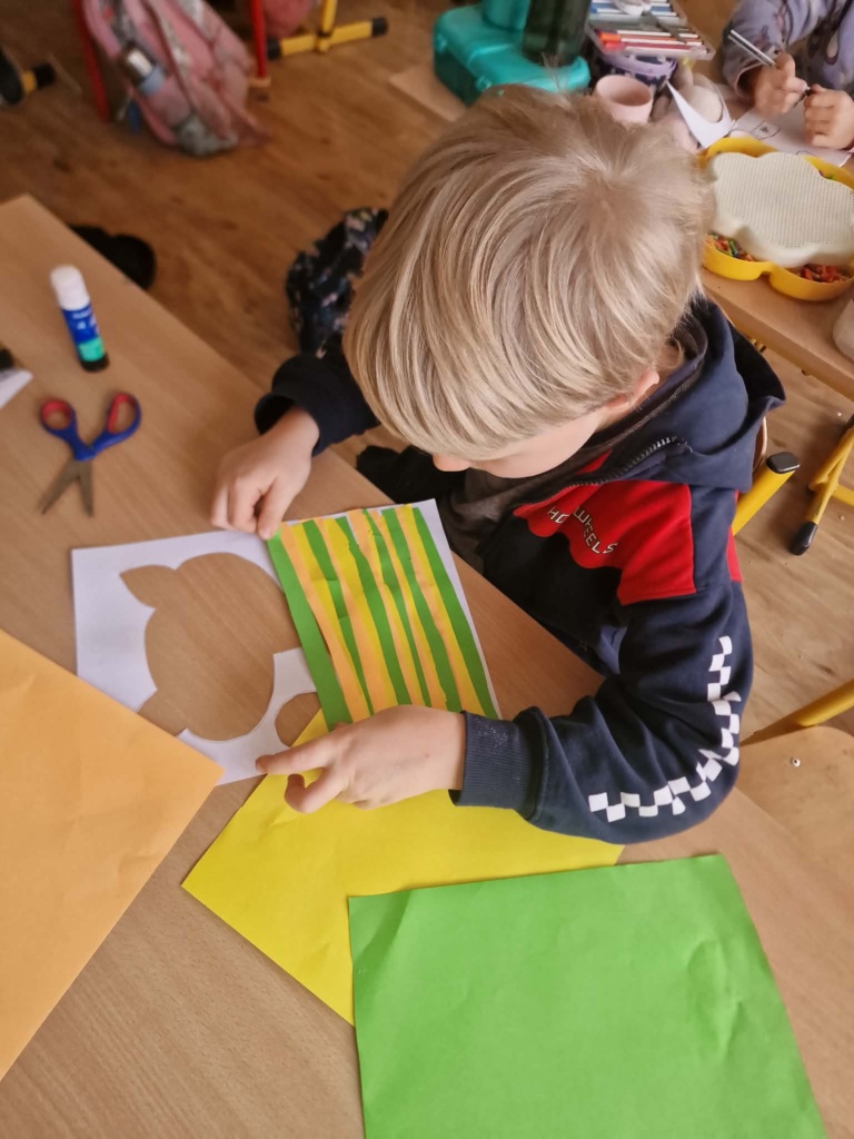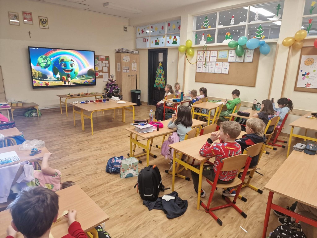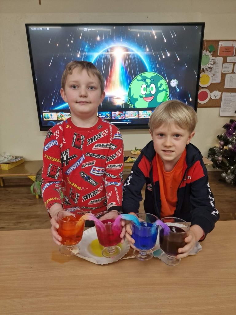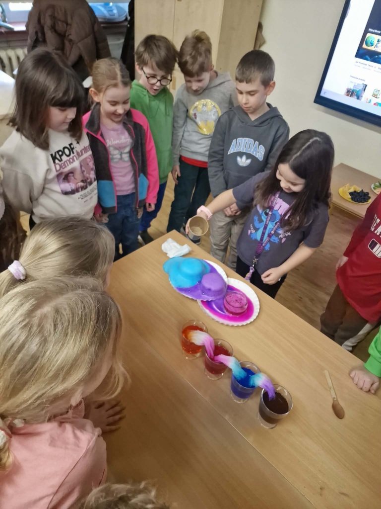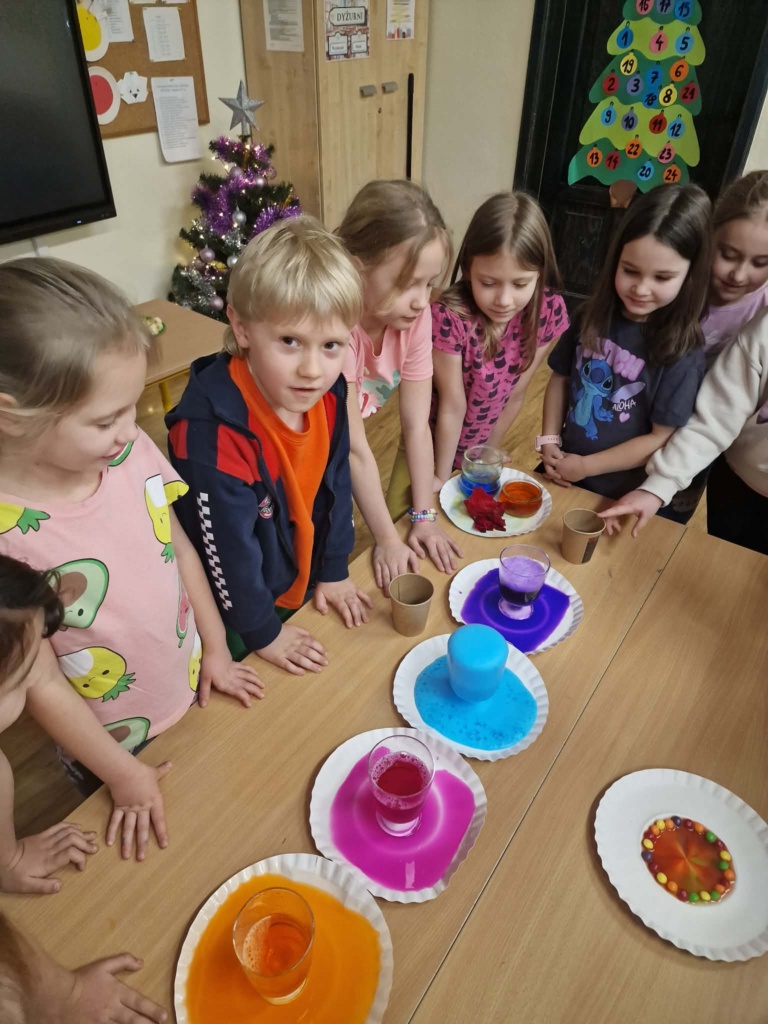 Dzieci miały wspaniały dzień pełnym kolorów! Malowały na folii, która owijała stoliki, tworząc tęczowe wzory. Korzystały z taśmy przezroczystej i flamastrów, aby wyświetlać kolory za pomocą latarek. Tworzyły kolorowe kotki i króliki z kolorowych pasów, a także tęcze z rozpuszczanych cukierków. Wykonywały wędrującą i wybuchową tęczę, która zachwyciła wszystkich. Miały również kolorowy poczęstunek z warzyw i owoców, które przyniosły z domu. To był czas wesoły i kolorowy, a przy tym pełen nowej wiedzy i doświadczeń.