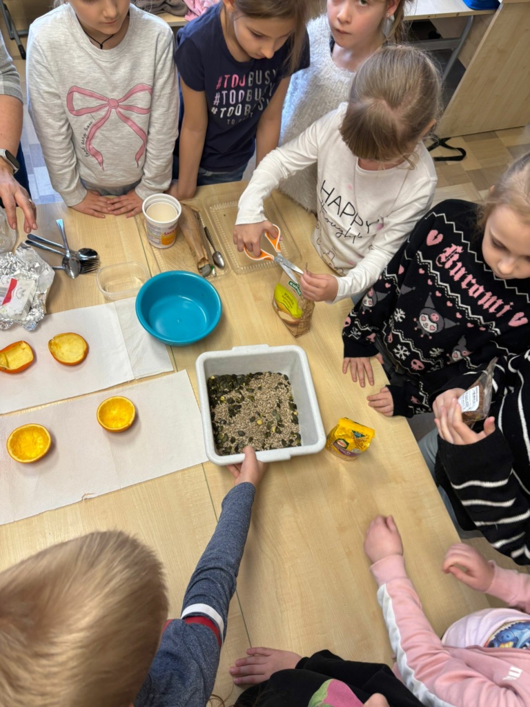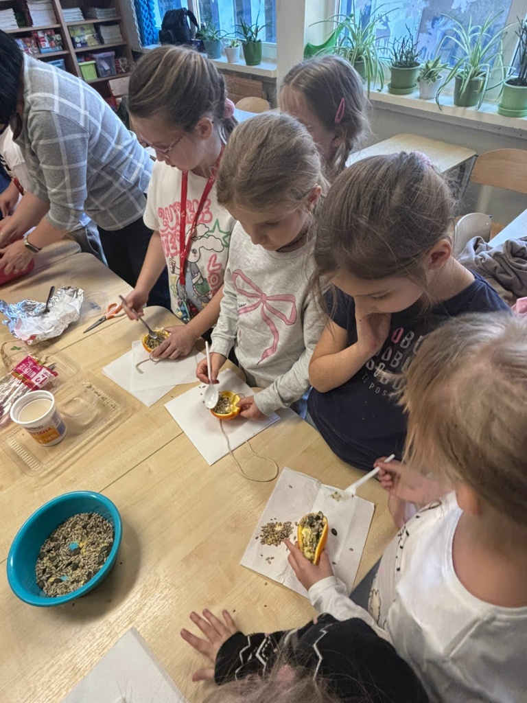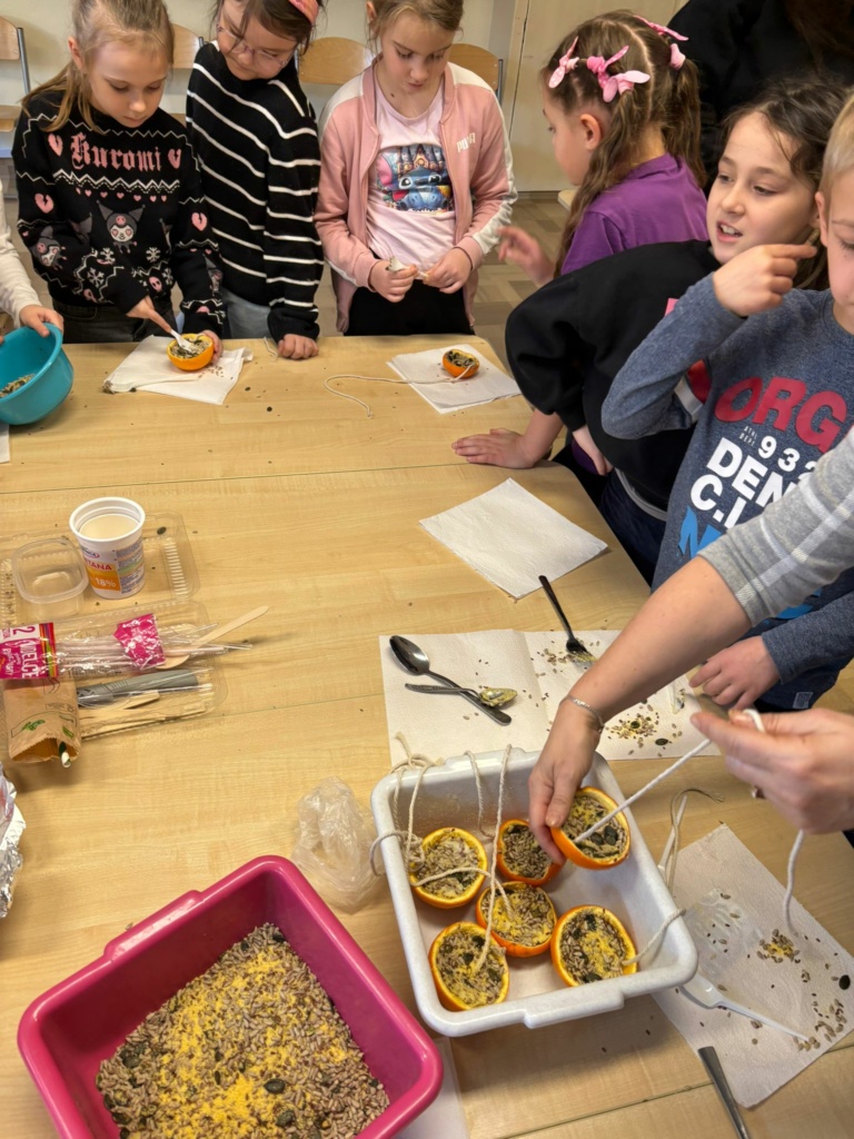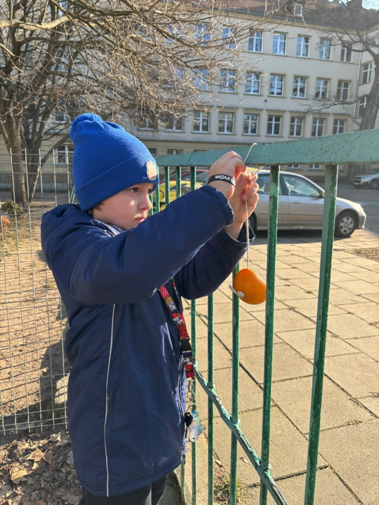Mróz i śnieg za oknem skłonił dzieci z klasy 1a, żeby zatroszczyć się o skrzydlatych gości na naszym szkolnym podwórku. Przygotowaliśmy w klasie ekologiczne karmniki z pomarańczy wypełnionych ziarnami słonecznika, dyni , siemienia lnianego i kaszy z dodatkiem tłuszczu. Nasze pomarańcze zawiesiliśmy na drzewach i ogrodzeniu w pobliżu naszej klasy. Teraz będziemy obserwować jakie ptaki przylecą do  ekologicznej stołówki. Musimy pamiętać o systematycznym uzupełnianiu przysmaków.