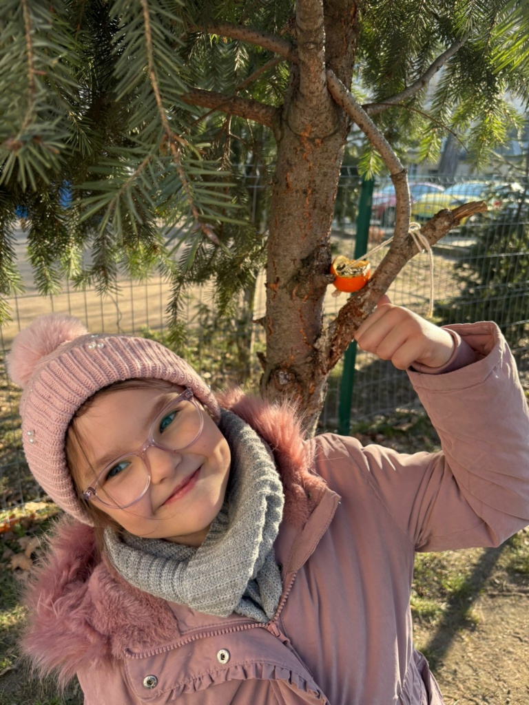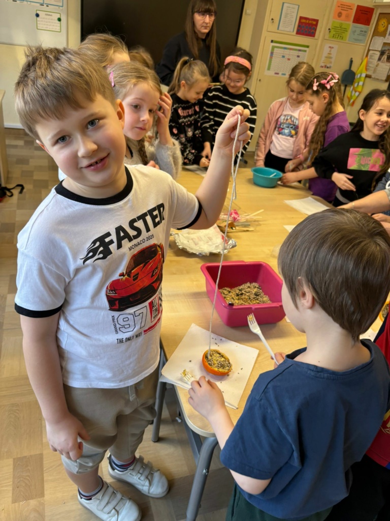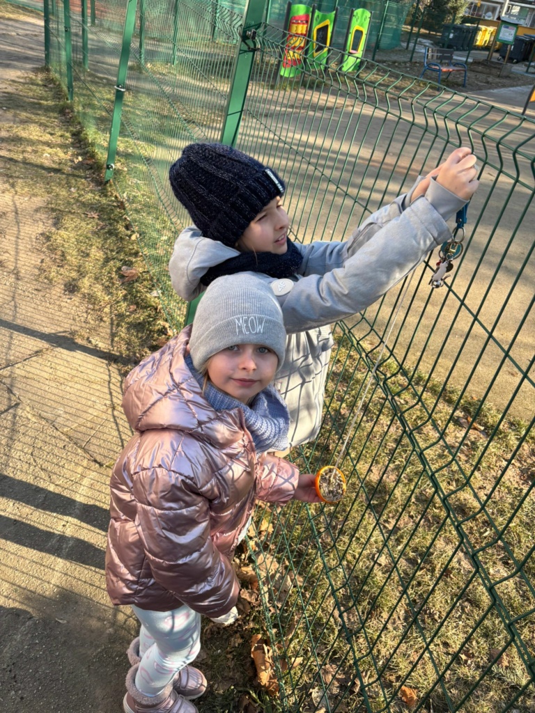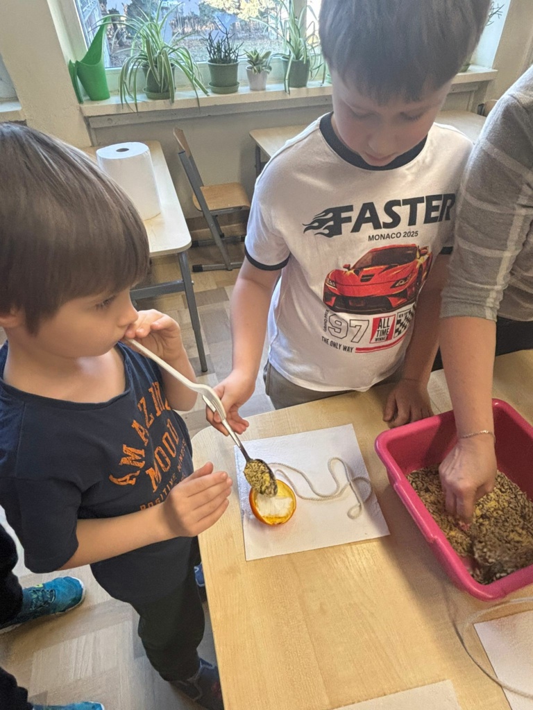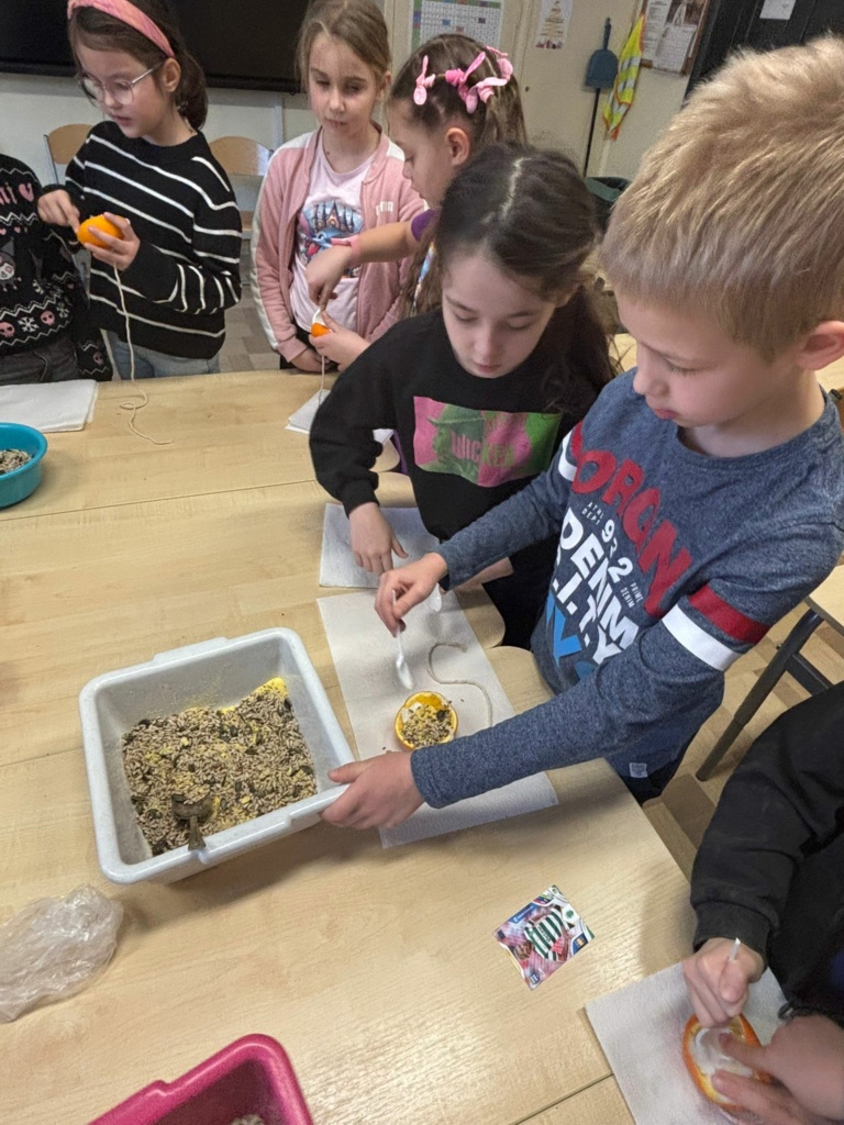 Mróz i śnieg za oknem skłonił dzieci z klasy 1a, żeby zatroszczyć się o skrzydlatych gości na naszym szkolnym podwórku. Przygotowaliśmy w klasie ekologiczne karmniki z pomarańczy wypełnionych ziarnami słonecznika, dyni , siemienia lnianego i kaszy z dodatkiem tłuszczu. Nasze pomarańcze zawiesiliśmy na drzewach i ogrodzeniu w pobliżu naszej klasy. Teraz będziemy obserwować jakie ptaki przylecą do  ekologicznej stołówki. Musimy pamiętać o systematycznym uzupełnianiu przysmaków.