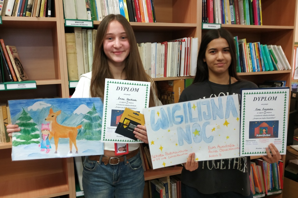 Z radością informuję, że uczennice klasy 8e Ewa Awadalla i Arina Obuchowa zajęły I miejsce w międzyszkolnym konkursie „Świąteczna bajka Kamishibai” zorganizowanym przez Szkołę Podstawową nr 20 we Wrocławiu.